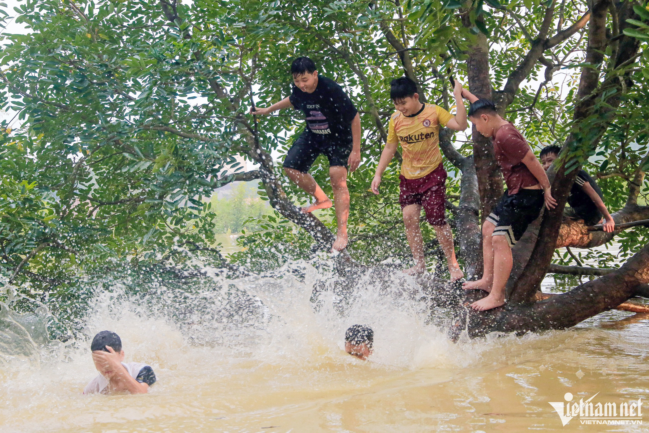 Phải nghỉ học ở nhà vì đường đến trường bị ngập lụt, nhiều trẻ em ở các thôn thuộc huyện Chương Mỹ (Hà Nội) rủ nhau ngụp lặn trong làn nước lũ đỏ au.