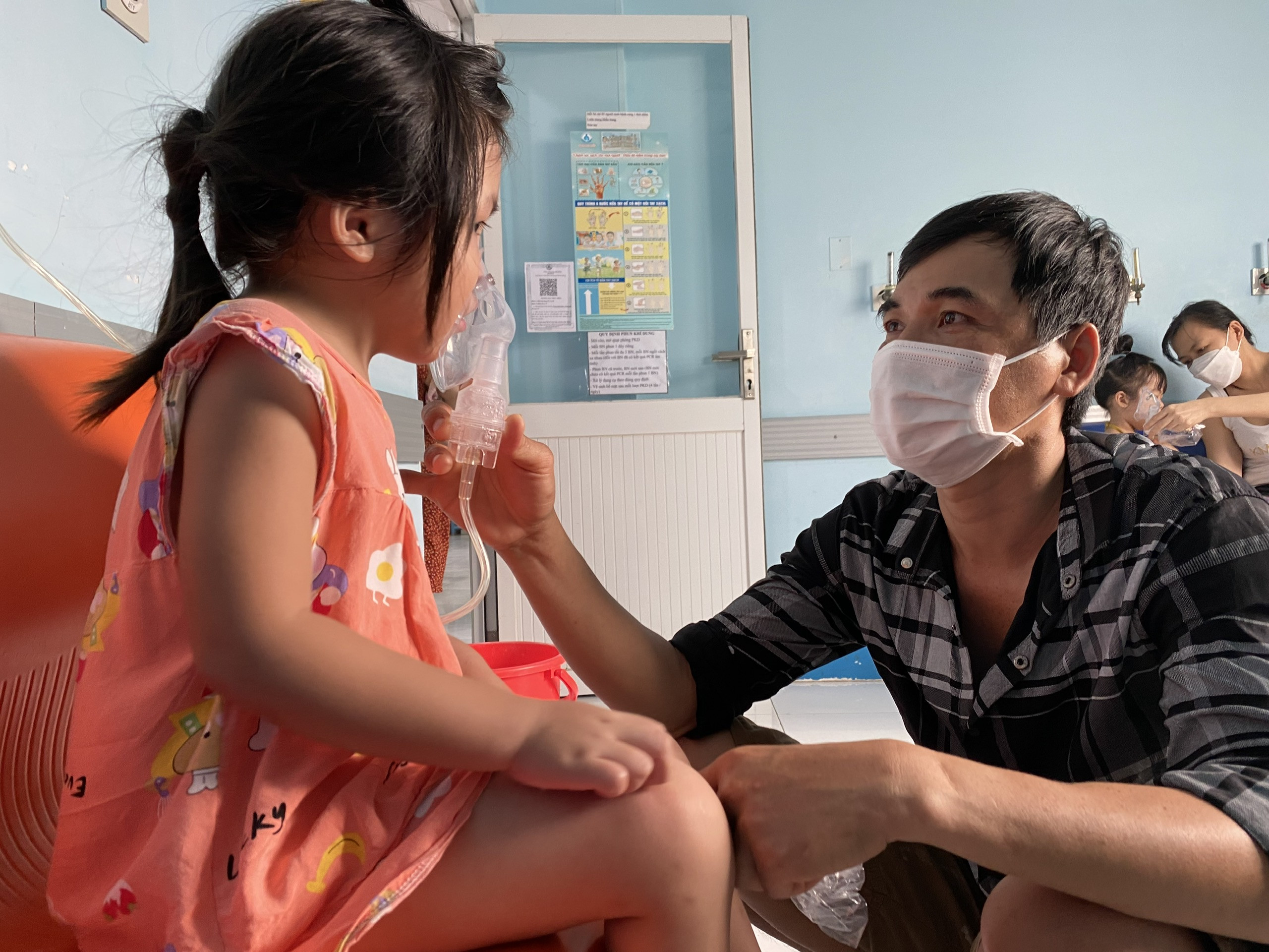 Anh Nguyễn Văn Bảo, 37 tuổi, Bến Tre, một tay xách đồ, một tay dẫn con gái 3 tuổi đi tìm phòng phun khí dung. Bé bị hen suyễn, vừa nhập viện sáng nay.
