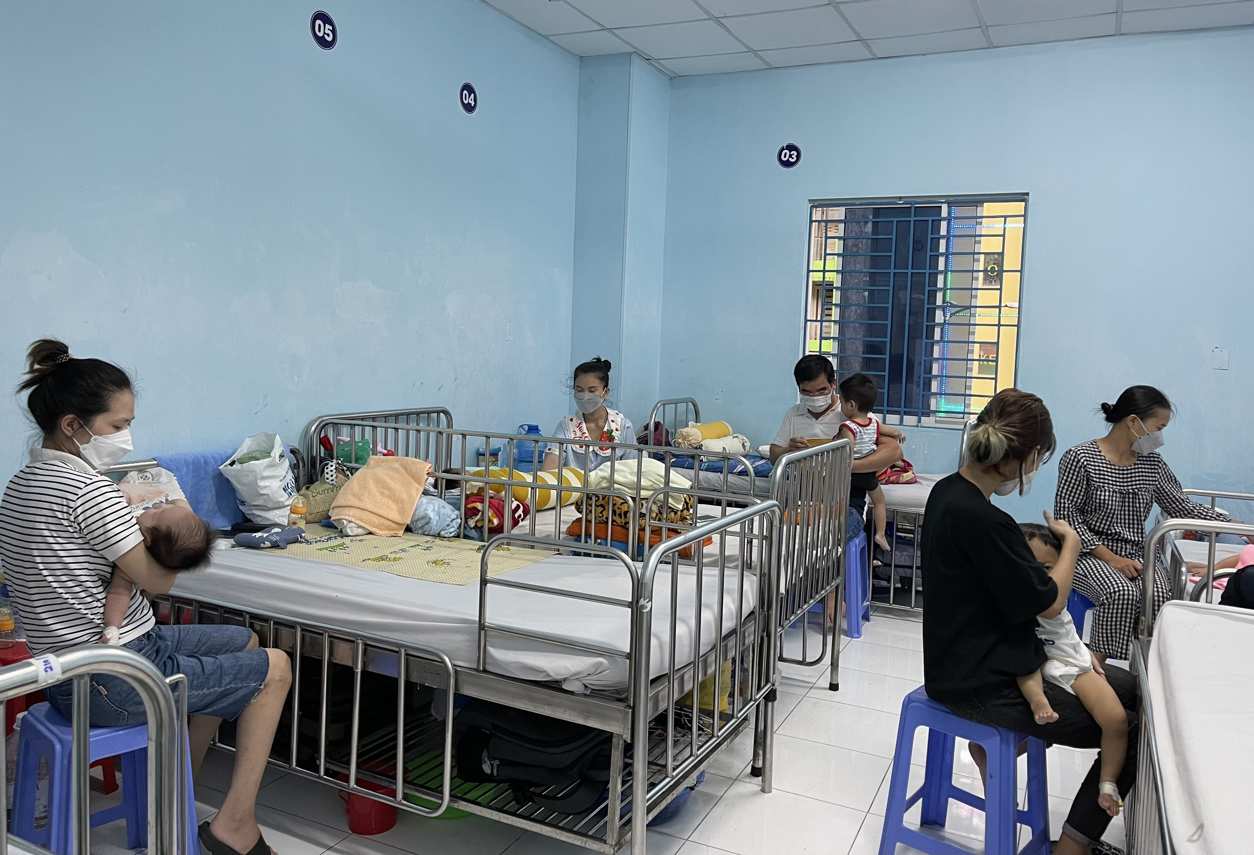 “Bệnh viện đông quá, nhưng mỗi cháu nằm một giường, không bị nằm ghép. Cực một cái là chỉ được một người chăm trẻ”, anh nói.