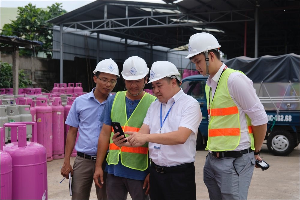 Các chuyên gia công nghệ đang triển khai giải pháp 4TeGas, giúp quản và truy xuất nguồn gốc bình gas, tại trạm chiết số 1 của Hoàng Anh Gas. |