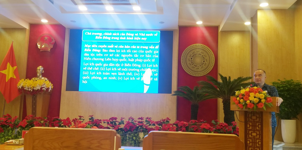Tại hội nghị, ông Nguyễn Mạnh Đông – Phó Chủ nhiệm Ủy ban Biên giới quốc gia – Bộ Ngoại giao đã chia sẻ các nội dung về bảo vệ vững chắc chủ quyền, quyền và lợi ích quốc gia trên Biển Đông trong tình hình mới; vấn đề Biển Đông trong công cuộc xây dựng và phát triển đất nước; các đặc điểm lớn của tình hình Biển Đông trong những năm gần đây; tình hình Biển Đông trên mặt trận chính trị, ngoại giao và pháp lý; việc xử lý vấn đề biển Đông trên mặt trận thông tin, tuyên truyền; chủ trương, chính sách của Đảng và Nhà nước về Biển Đông trong tình hình hiện nay.