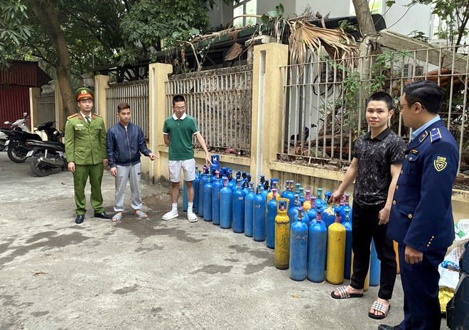 Lực lượng chức năng đã lập biên bản, đưa những người liên quan cùng 56 bình khí N20 về trụ sở để đấu tranh.