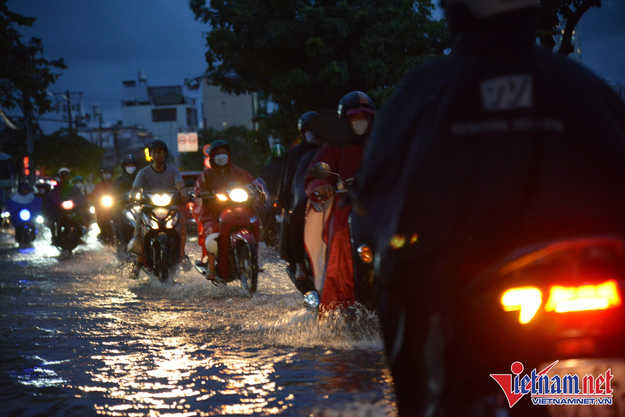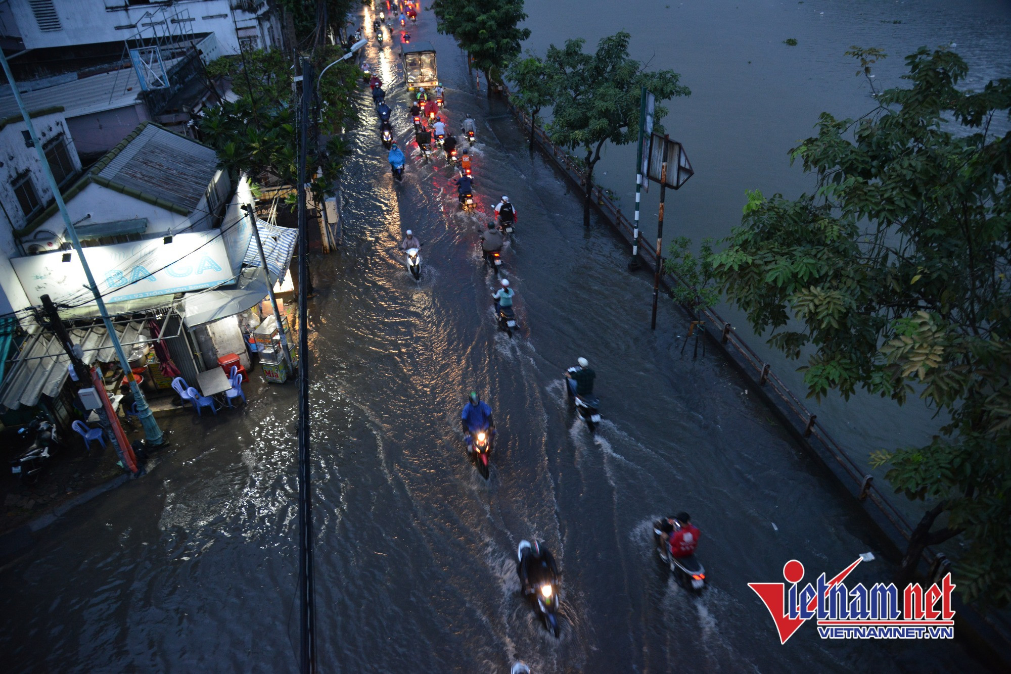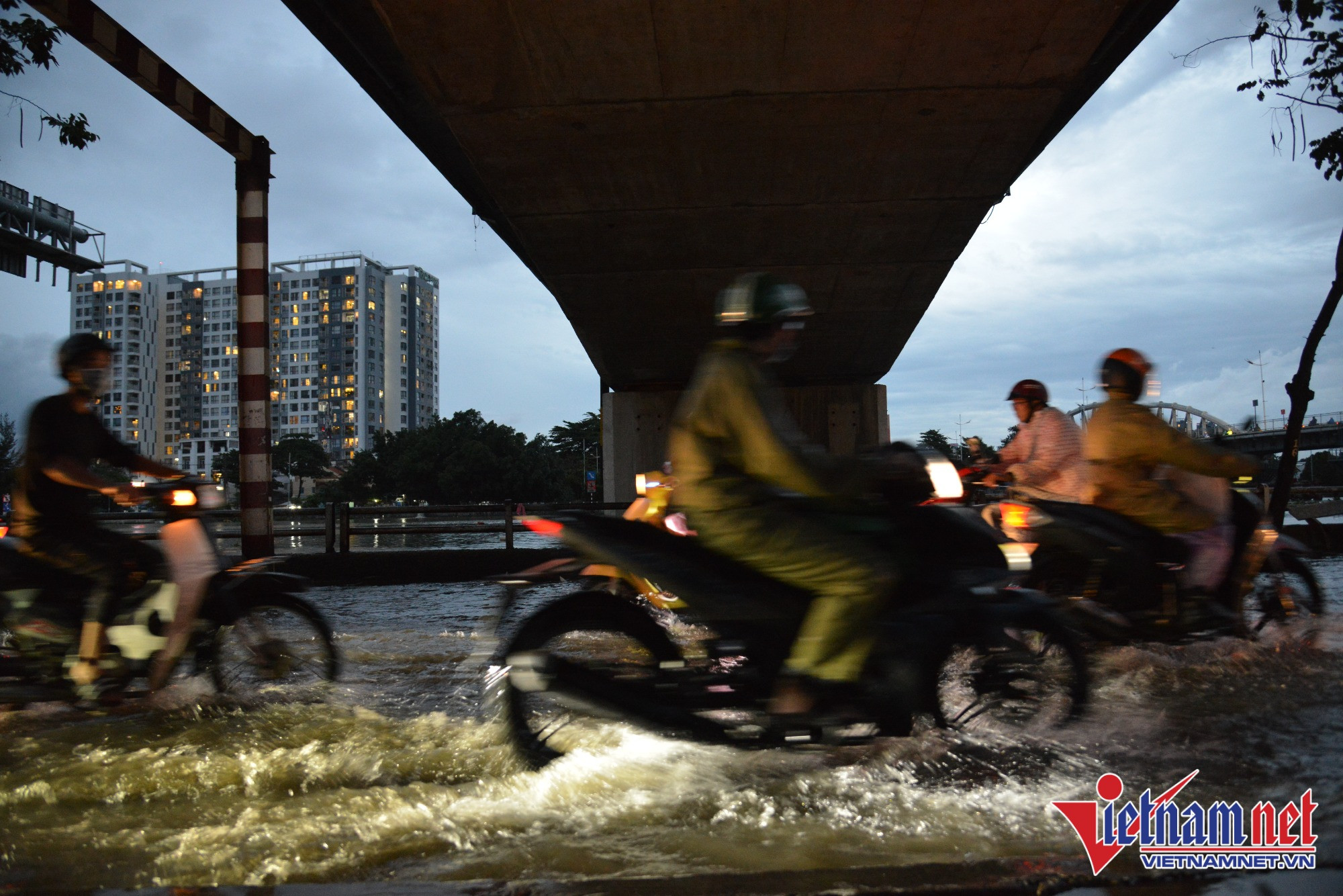 Ghi nhận tối 27/9 trên đường Trần Xuân Soạn (phường Tân Thuận Tây, Quận 7), nước từ kênh Tẻ dâng cao tràn qua các tuyến kè và tràn lên đường gây ngập kéo dàiNhiều đoạn nước ngập sâu hơn nửa bánh xe khiến người dân đi lại rất khó khănTheo Đài khí tượng thủy văn khu vực Nam Bộ, trong ngày 27/9 (2/9 âm lịch), mực nước cao nhất tại trạm Phú An - sông Sài Gòn đạt 1,58m (lúc 6h3) và 1,57m (lúc 18h), xấp xỉ báo động IIINước ngập vào giờ tan tầm khiến việc đi lại của người dân càng khó khănCả đoạn đường dài bị nước triều cường khỏa lấp khiến người đi đường khó phân biệt đâu là đường, đâu là sông hay kênhDự kiến, trong ngày 28/9 (3/9 âm lịch) triều cường tiếp tục đạt mức 1,59m (lúc 7h30) và 1,60m (lúc 19h) và các ngày tiếp theo sẽ giảm dần