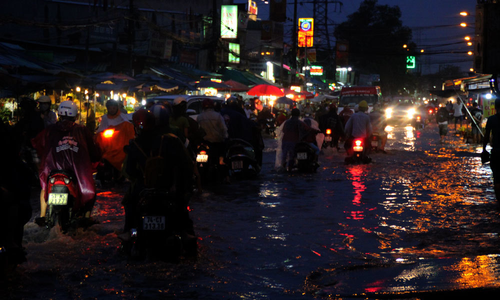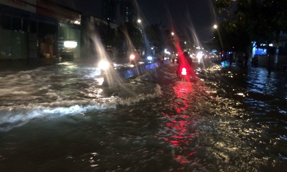 Theo người dân, tuyến đường Huỳnh Tấn Phát bị triều cường "tấn công" từ 17 giờ chiều. Cả đoạn đường kéo dài 5 km chìm trong triều cường, hàng trăm xe máy bị ngập, phải dẫn bộ trong cơn mưa tầm tã...