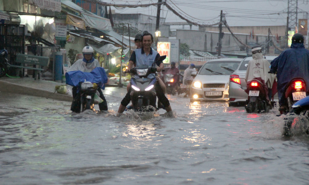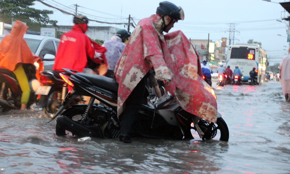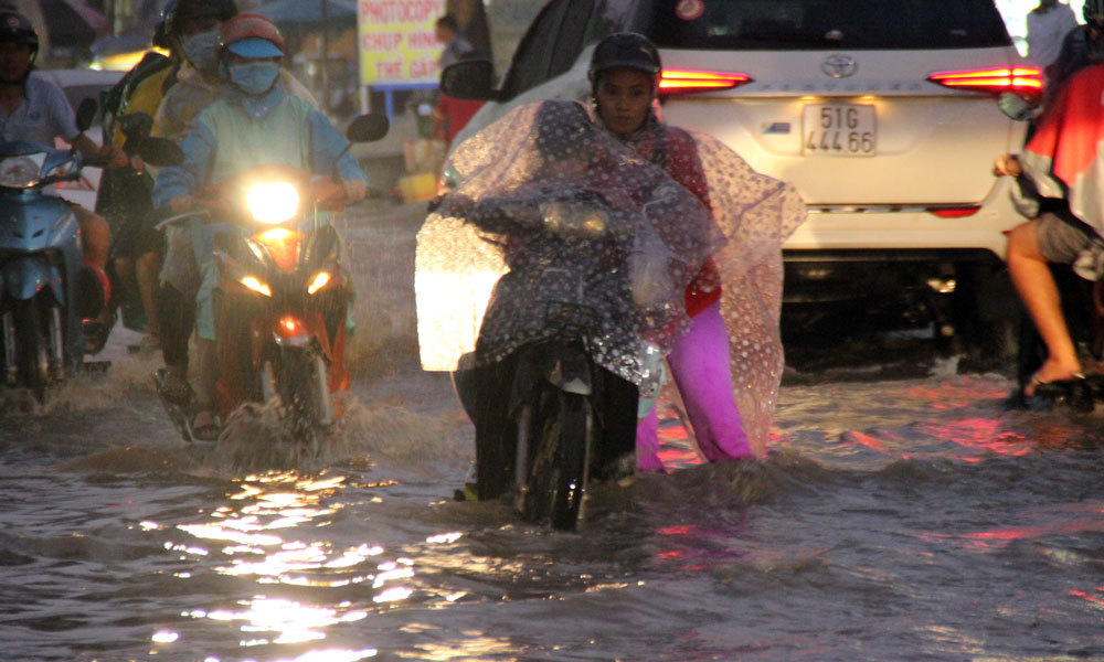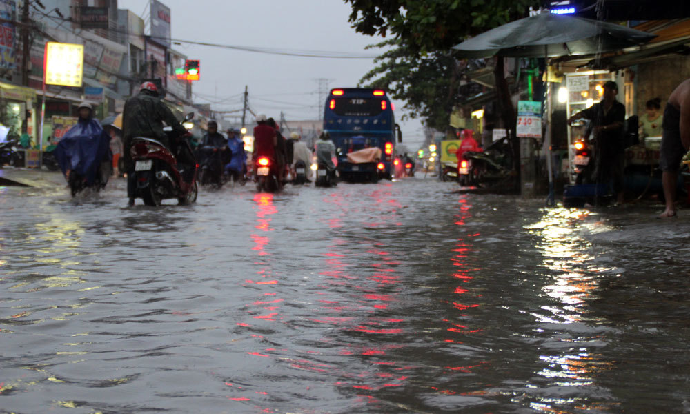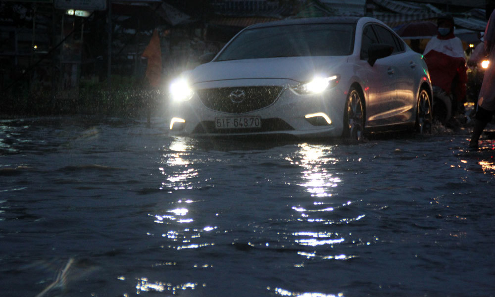 Nhiều trận mưa giông kéo dài trong hôm nay, cùng với thời điểm triều cường dâng cao khiến đoạn đường Hồ Ngọc Lãm, phường An Lạc, quận Bình Tân (TP.HCM) ngập nặng.