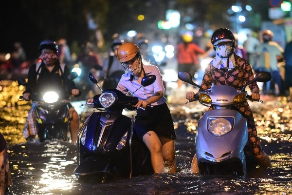 Triều cường gây ngập vào giờ tan tầm khiến người dân đi lại rất khó khăn.