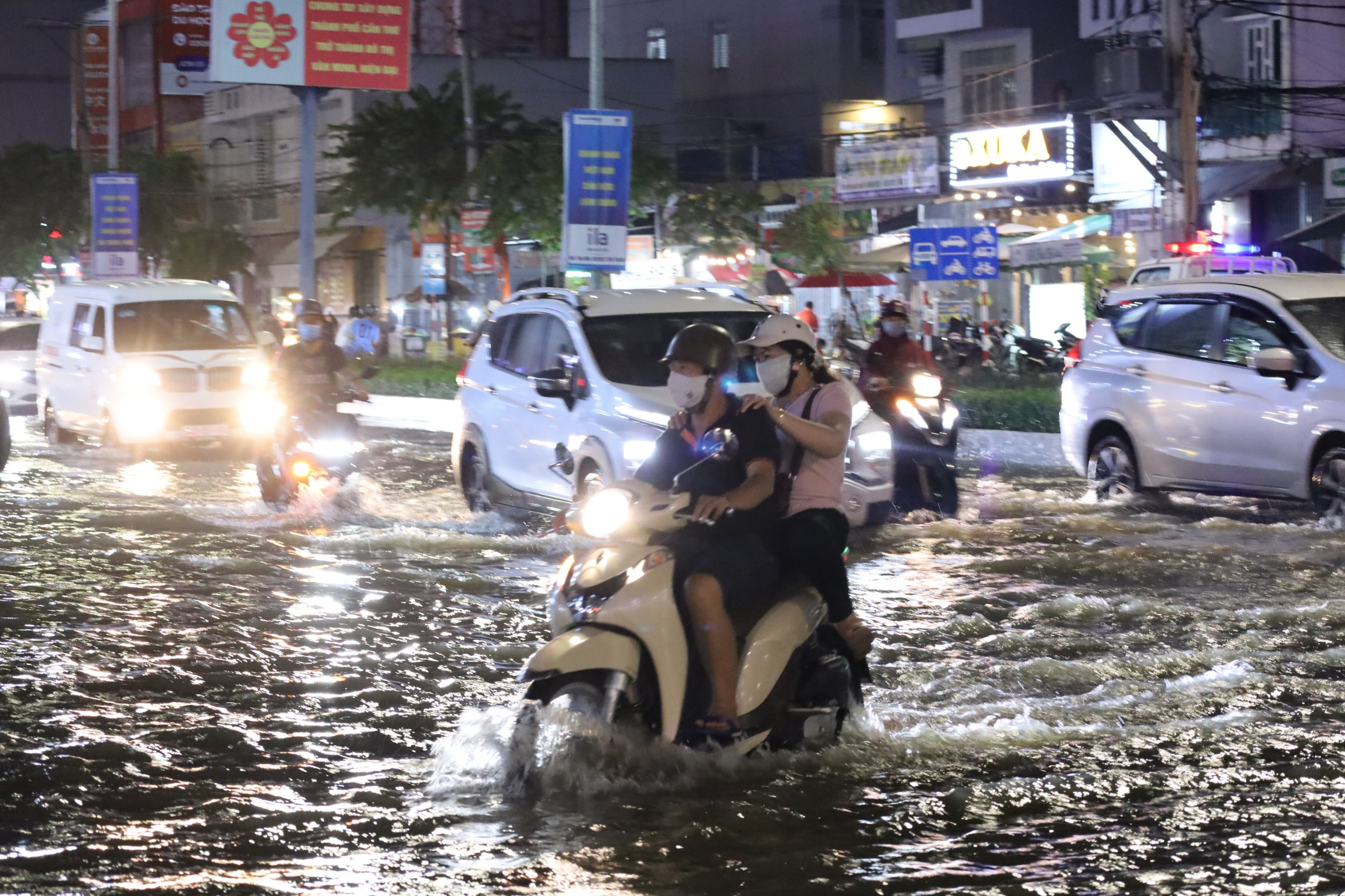 Ngày 2/10, triều cường ở Cần Thơ tiếp tục vượt ngưỡng báo động 3 khiến nhiều tuyến đường trung tâm thành phố (đường Cách Mạng Tháng Tám, Mậu Thân, Xô Viết Nghệ Tĩnh..) bị ngập khoảng 20-50cm.Thời điểm triều cường dâng cao đúng vào lúc người dân đến công sở, đưa con đi học nên một số nơi xảy ra tình trạng ùn tắc giao thông. Tại đường Lý Tự Trọng, nước dâng cao ngập nửa bánh xe, người phụ nữ chật vật đưa con tới trường.Ban Chỉ huy Phòng thủ dân sự - Phòng chống thiên tai và Tìm kiếm cứu nạn thành phố Cần Thơ cho biết, mực nước cao nhất tại trạm Cần Thơ trên sông Hậu đo lúc 6h30 là 2,11m. Dự báo chiều nay triều cường sẽ tiếp tục tăng.Nước tràn cả vào nhà dân. Tối 1/10, triều cường cũng dâng cao ảnh hưởng rất lớn tới việc đi lại, kinh doanh buôn bán của người dân.