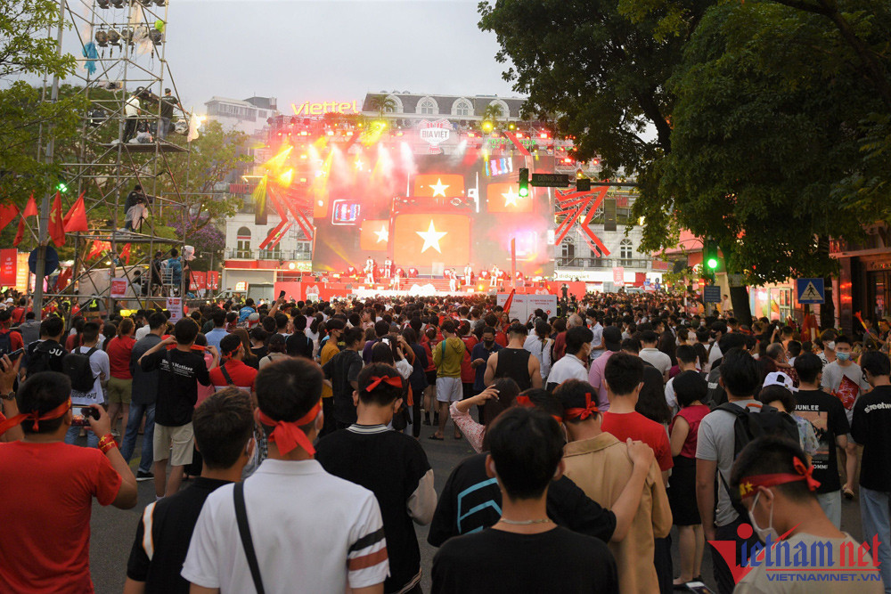 Từ 17h, hàng trăm cổ động viên đã dồn về khu vực quảng trường Đông Kinh Nghĩa Thục (Hoàn Kiếm, Hà Nội) để theo dõi trận chung kết bóng đá nam SEA Games 31 qua màn hình lớn.