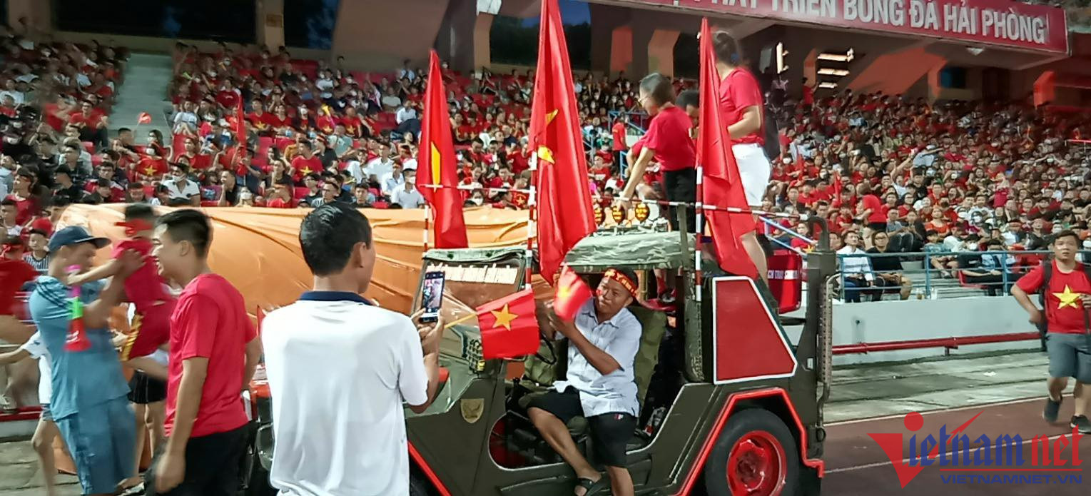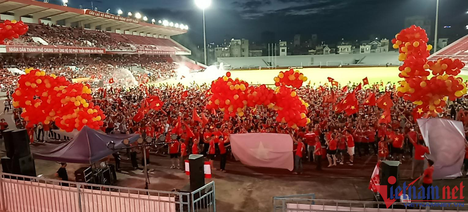 Các CĐV đã trang trí phương tiện, loa, kèn và trang phục, cờ đỏ sao vàng để cổ vũ cho đội U23 Việt Nam.Màn thả bóng bay ấn tượng tại sân Lạch Tray như muốn gửi lời cầu mong chiến thắng của CĐV đất Cảng.Pháo sáng cũng được các CĐV nổ nhiều trước khi những phút đầu đầu tiên của trận bóng bắt đầu. Lực lượng công an Hải Phòng có mặt rất sớm để bảo vệ công tác an ninh trật tự tại đây. Ảnh: Hoài Anh