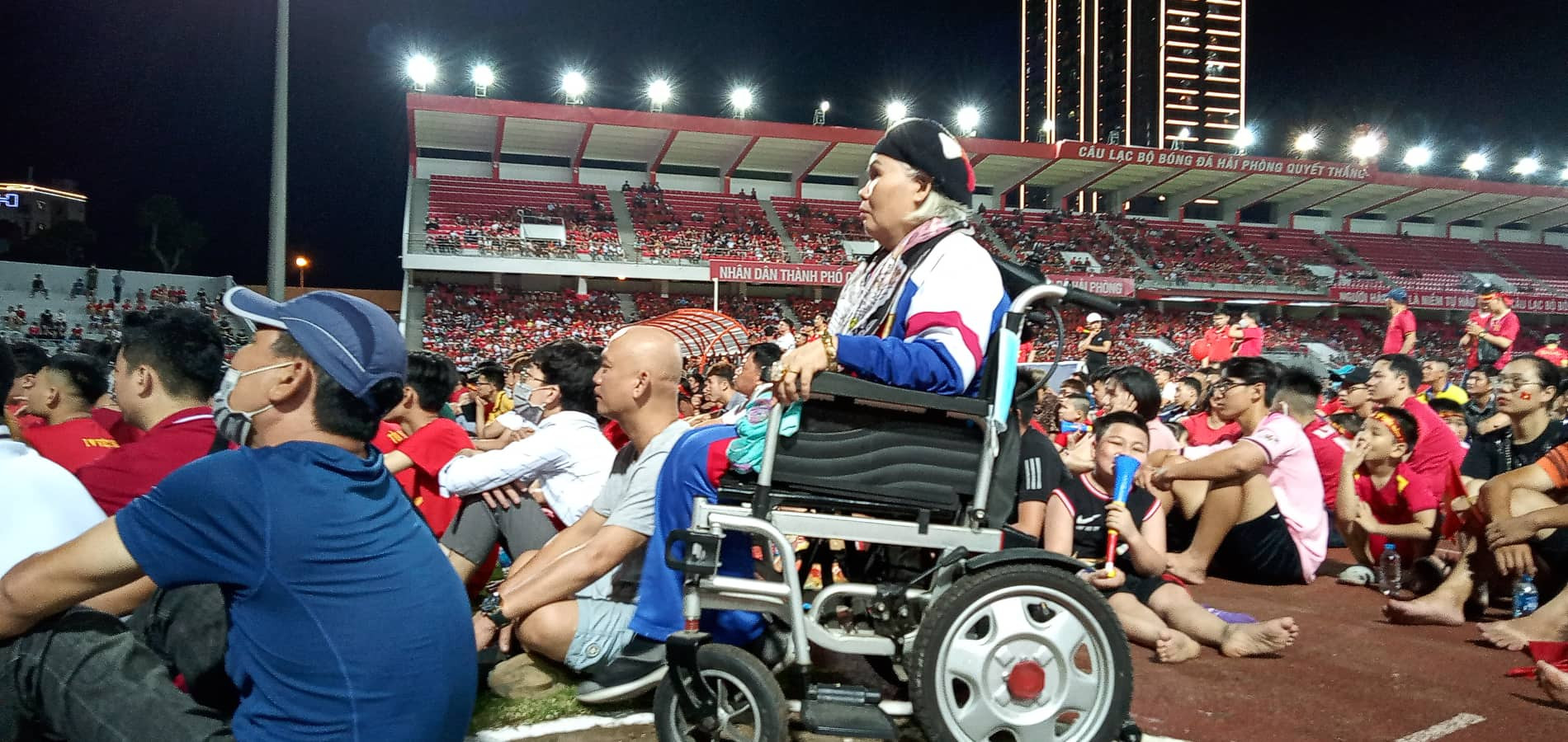 Cụ bà Đỗ Thị Liễu, 70 tuổi, trú tại Tô Hiệu, TP Hải Phòng dù bị tai biến ngồi trên xe lăn nhiều năm nhưng chiều nay vẫn yêu cầu con trai đưa ra sân Lạch Tray để xem bóng đá. Ảnh: Việt Khang