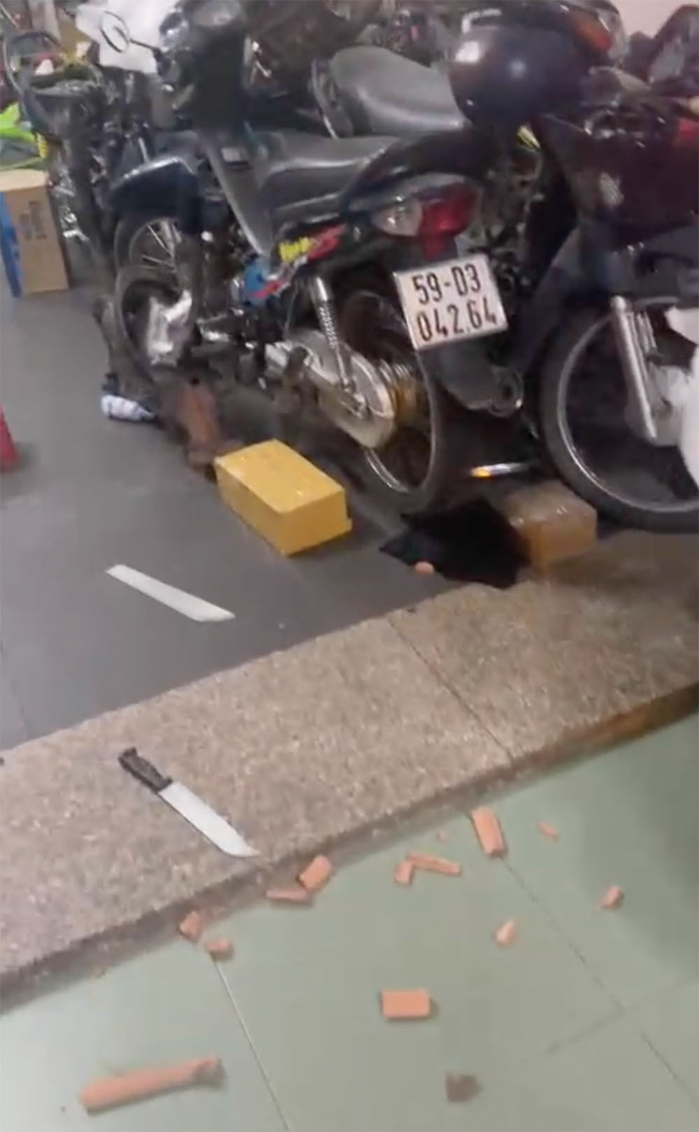 Nhóm đối tượng dùng dao, mã tấu chém liên tiếp vào xe gắn máy, cửa nhà, tủ lạnh. Theo ông H, nhóm thanh thiếu niên ném hai con dao và nhiều gạch đá vào nhà nhưng may mắn không ai bị thương.