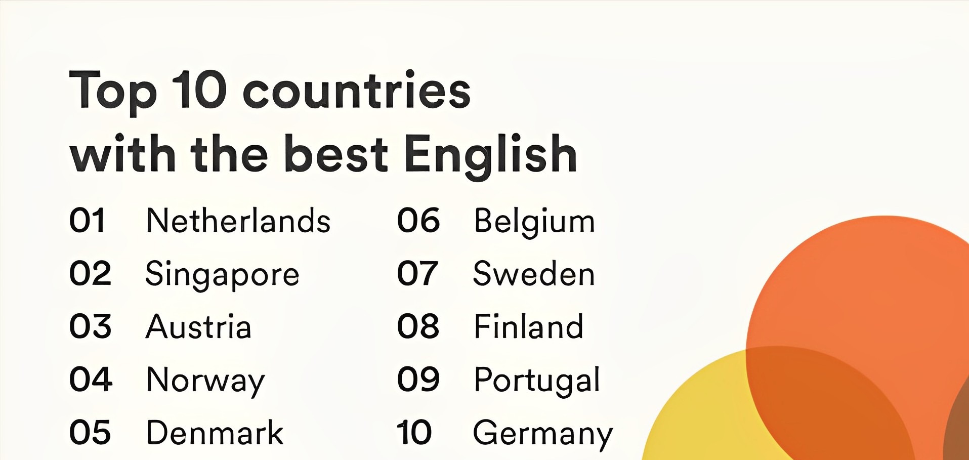 Top 10 quốc gia nói tiếng Anh tốt nhất thế giới, theo EF EPI, trong đó, top3 lần lượt là Hà Lan, Singapore và Áo.