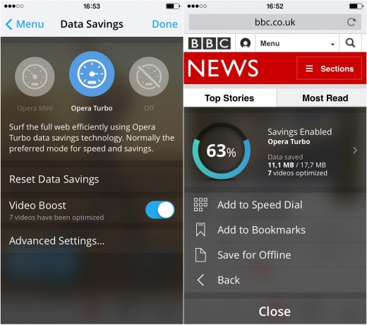 Opera mới đây vừa ra mắt phiên bản chính thức của trình duyệt Opera mini 9 cho iOS, với hứa hẹn giúp người dùng xem video mượt mà hơn nhờ tính năng Video Boost. Tính năng này sẽ giúp tối ưu hóa nội dung các video để chúng tải (load) nhanh hơn và tiêu tốn ít dữ liệu hơn. Video Boost sử dụng công nghệ Rocket Optimizer, là công nghệ mà Opera sở hữu sau khi họ mua lại Skyfire - một hãng chuyên về công nghệ nén video và dữ liệu - hồi năm ngoái.