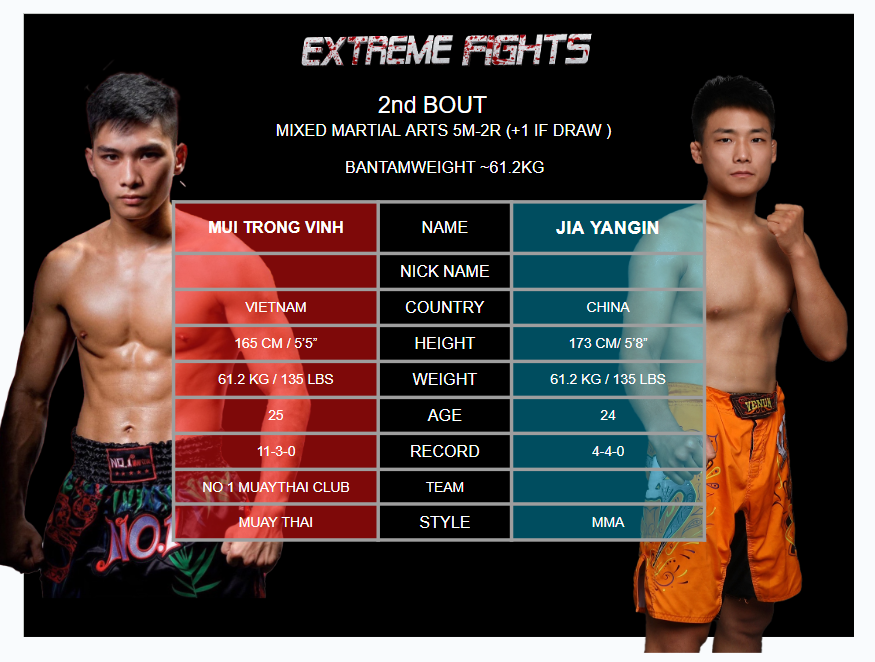 Bên cạnh đó hạng cân Bantam Weight, võ sĩ Mùi Trọng Vinh so găng với võ sĩ tài năng của người Trung Quốc Jia Yangin. Đại diện còn lại của chủ nhà là Lưu Đức Mạnh đối đầu với đối thủ người Hàn Quốc Park Seong Hyun.