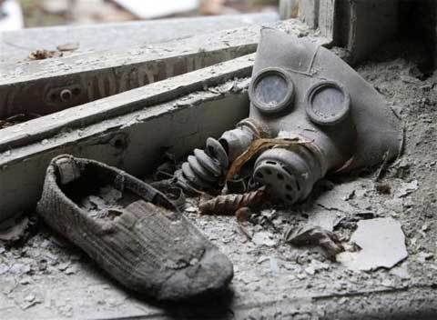 Mặt nạ khí của trẻ em và một chiếc giày vẫn nằm chỏng chơ tại một nhà trẻ ở thành phố bị bỏ hoang Prypiat gần nhà máy điện hạt nhân Chernobyl. Chỉ còn 20 ngày nữa, Nga, Belarus và Ukraine sẽ đánh dấu 25 năm ngày nổ lò phản ứng hạt nhân ở Chernobyl, nơi tai nạn hạt nhân dân sự tồi tệ nhất diễn ra vào ngày 26/4/1986.