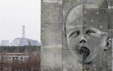 Một chiếc quách bằng đá phủ lên lò phản ứng số 4 bị hỏng tại nhà máy Chernobyl nằm sau tòa nhà được trang trí bằng hình vẽ trên tường