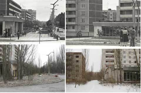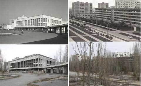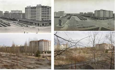 Hình ảnh kết hợp, được chụp năm 1982 và sau này là 31/3/2011 (ảnh dưới) cho thấy quang cảnh trước đây và hiện nay của thành phố Prypiat
