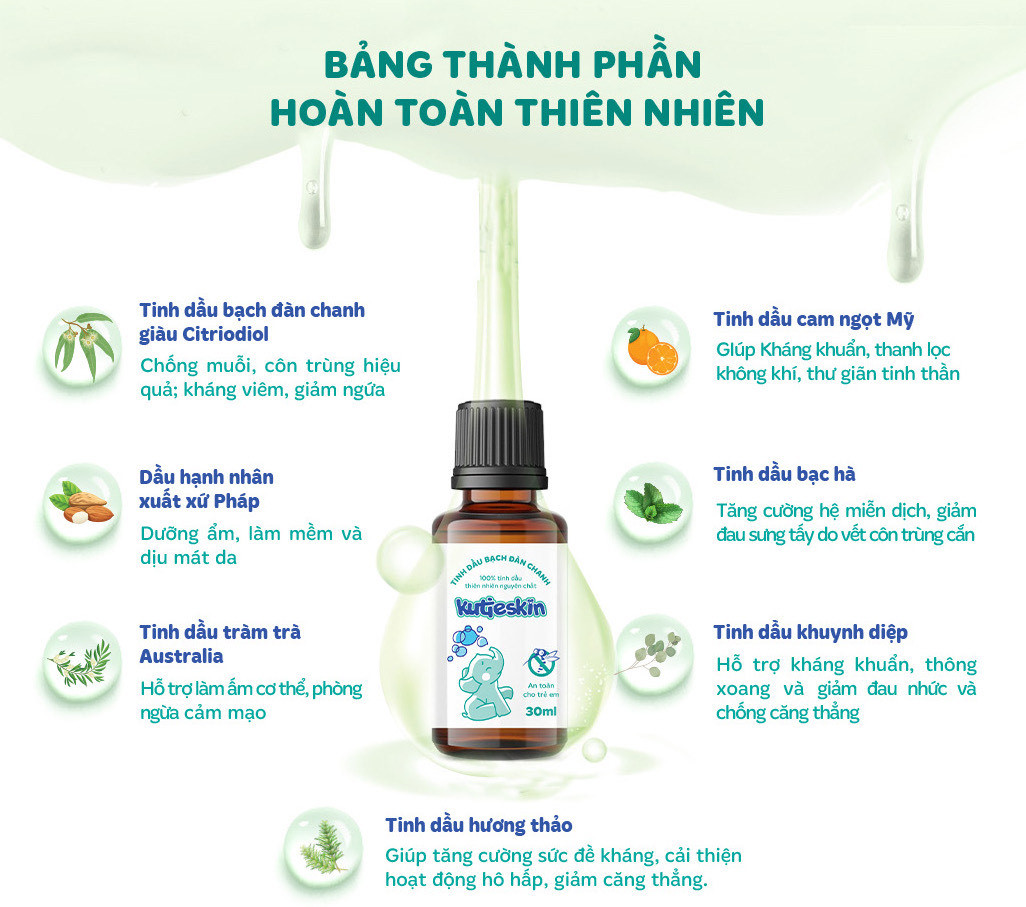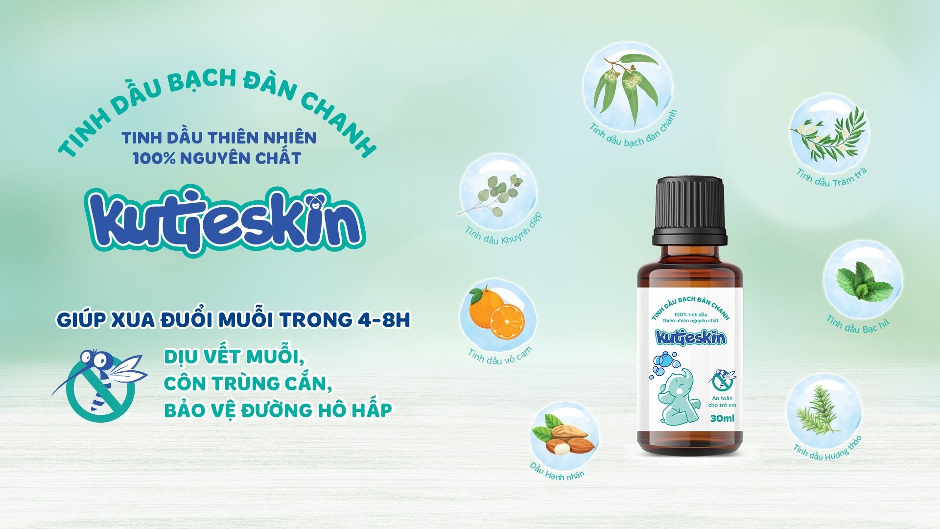 Sản phẩm có thành phần chính là tinh dầu bạch đàn chanh cùng tinh dầu tràm trà, do đó có thể xua đuổi muỗi và côn trùng. Người dùng chỉ cần thoa lớp mỏng tinh dầu trên da là đủ để tạo lớp màng bảo vệ da trong 4 - 8 giờ đồng hồ. Với đặc điểm nổi bật này, tinh dầu bạch đàn chanh Kutieskin là “trợ thủ” đắc lực trong ngăn ngừa, phòng chống muỗi đốt và dịch sốt xuất huyết đang phổ biến hiện nay.