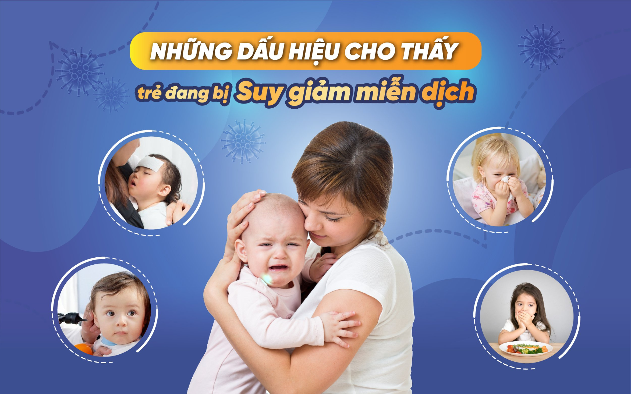 Có nhiều nguyên nhân dẫn đến suy giảm miễn dịch như: do di truyền, bẩm sinh, chế độ sinh hoạt, dinh dưỡng không đảm bảo… Với trẻ em, hệ miễn dịch chưa hoàn thiện như người lớn nên dễ mắc các bệnh nhiễm trùng nặng, dai dẳng và tái phát nhiều đợt. Để phát hiện sớm trẻ có đang bị suy giảm miễn dịch không, phụ huynh cần lưu ý một số dấu hiệu nghi ngờ như: bị nhiễm trùng dai dẳng; tái phát các bệnh nhiễm trùng tai (4 lần/năm); viêm xoang (2 lần/năm); viêm mũi (2 lần/năm); viêm nhiễm các cơ quan nội tạng… với thời gian điều trị mỗi lần tái phát thường kéo dài từ 4 - 8 tuần. Bên cạnh đó, trẻ cũng hay gặp các vấn đề về tiêu hoá như: tiêu chảy, táo bón, chán ăn.