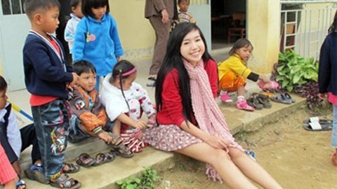 | Hoa hậu Hoàn vũ 2007 Riyo Mori diện đồ thể thao khỏe khoắn khi tới xã Khánh Thành (huyện Khánh Vĩnh, tỉnh Khánh Hòa) (Ảnh: VNE) |