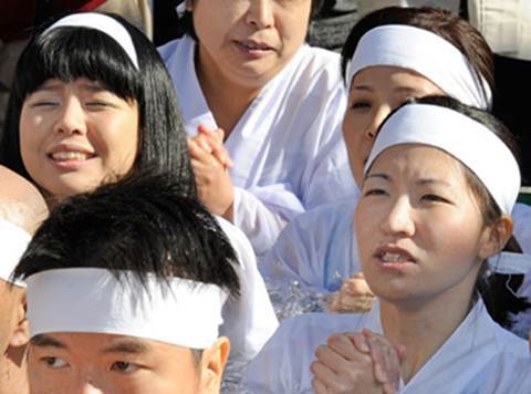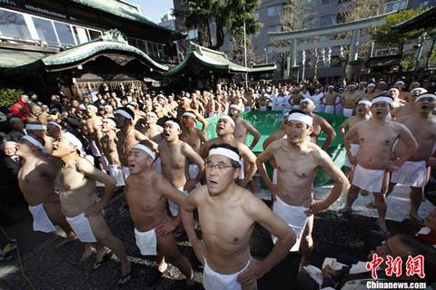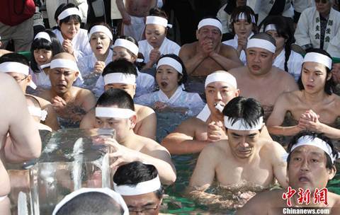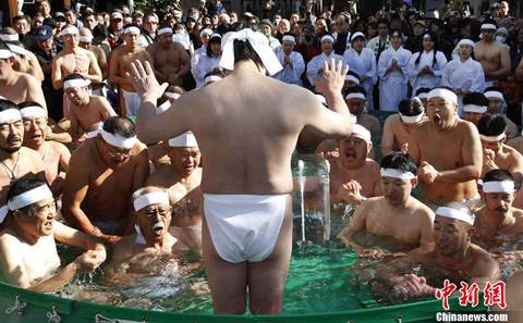Mặc dù nhiệt độ ở Tokyo trong những ngày này khoảng 3-4 độ nhưng những người dân từ già, trẻ, gái, trai đều cùng nhau nhảy xuống bể nước đá lạnh ngắt được đặt trước cửa đền.