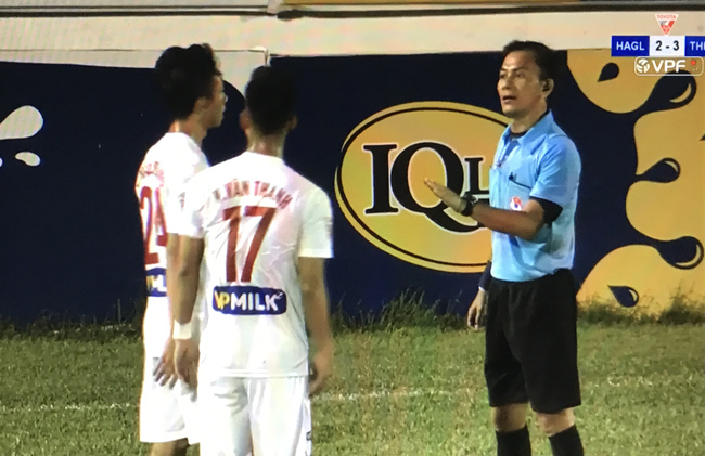 Trọng tài chính Xuân Nguyện vừa khiến các fan của đội chủ nhà tức giận khi không công nhận bàn thắng nâng tỉ số lên 3-0 của Văn Thanh, bất chấp trước đó đã chỉ tay lên chấm giao bóng giữa sân.