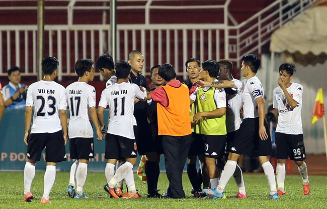 Trong khi đó, trọng tài Nguyễn Trọng Thư – người cầm còi trong trận đấu trò hề trên sân Thống Nhất vừa qua, tuyên bố: anh em trọng tài nội sẽ xin nghỉ làm giải luôn nếu tiếp tục không được tôn trọng. Trước phản ứng gay gắt từ dư luận, ông Nguyễn Trọng Thư khẳng định nếu BTC cảm thấy không tin tưởng trọng tài nội có thể thuê hết trọng tài ngoại!