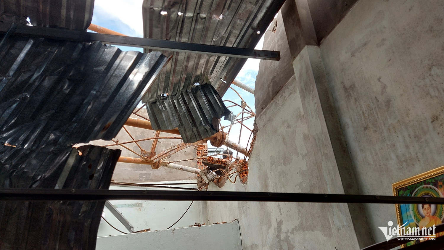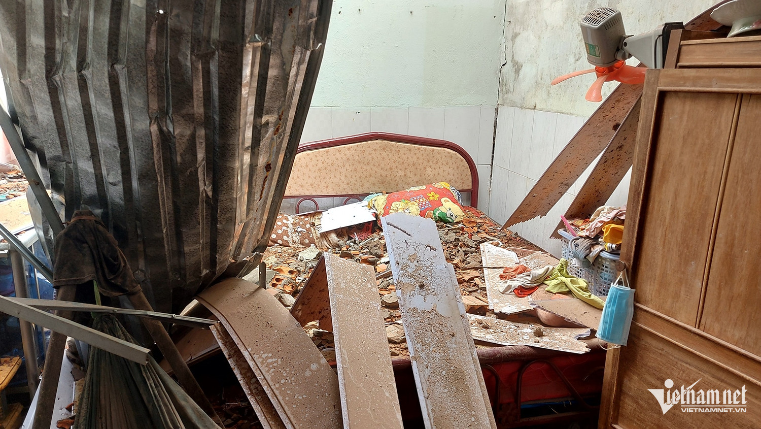 “Tôi nghe tiếng nổ lớn như bom, nghĩ nhà trọ sát vách nổ bình ga, bụi mù mịt. Đi lên tầng 2 mới thấy trụ ăng-ten đổ đè lên dãy trọ khiến 3 căn nhà bị thiệt hại nặng”, chị Quỳnh cho hay.