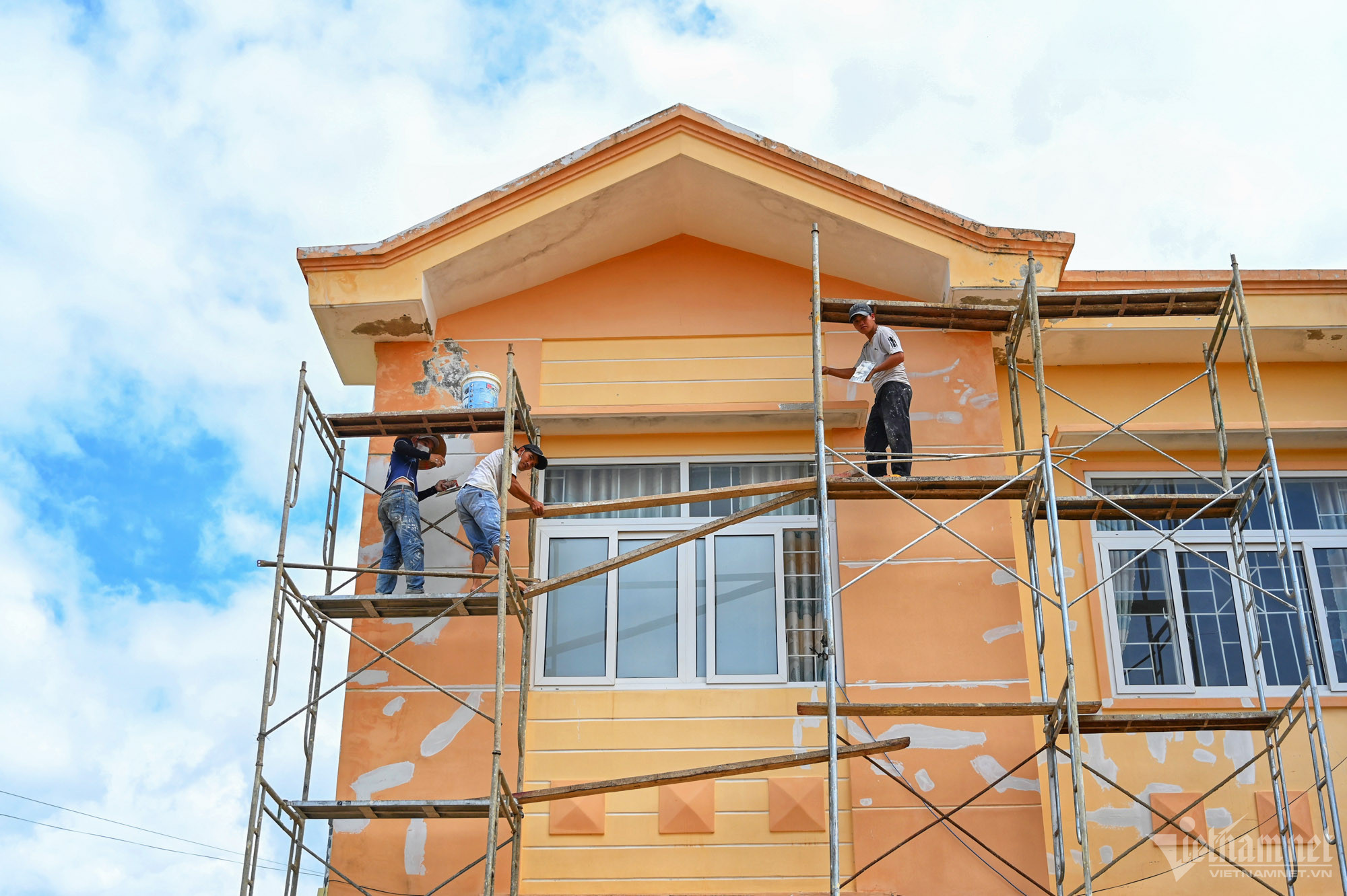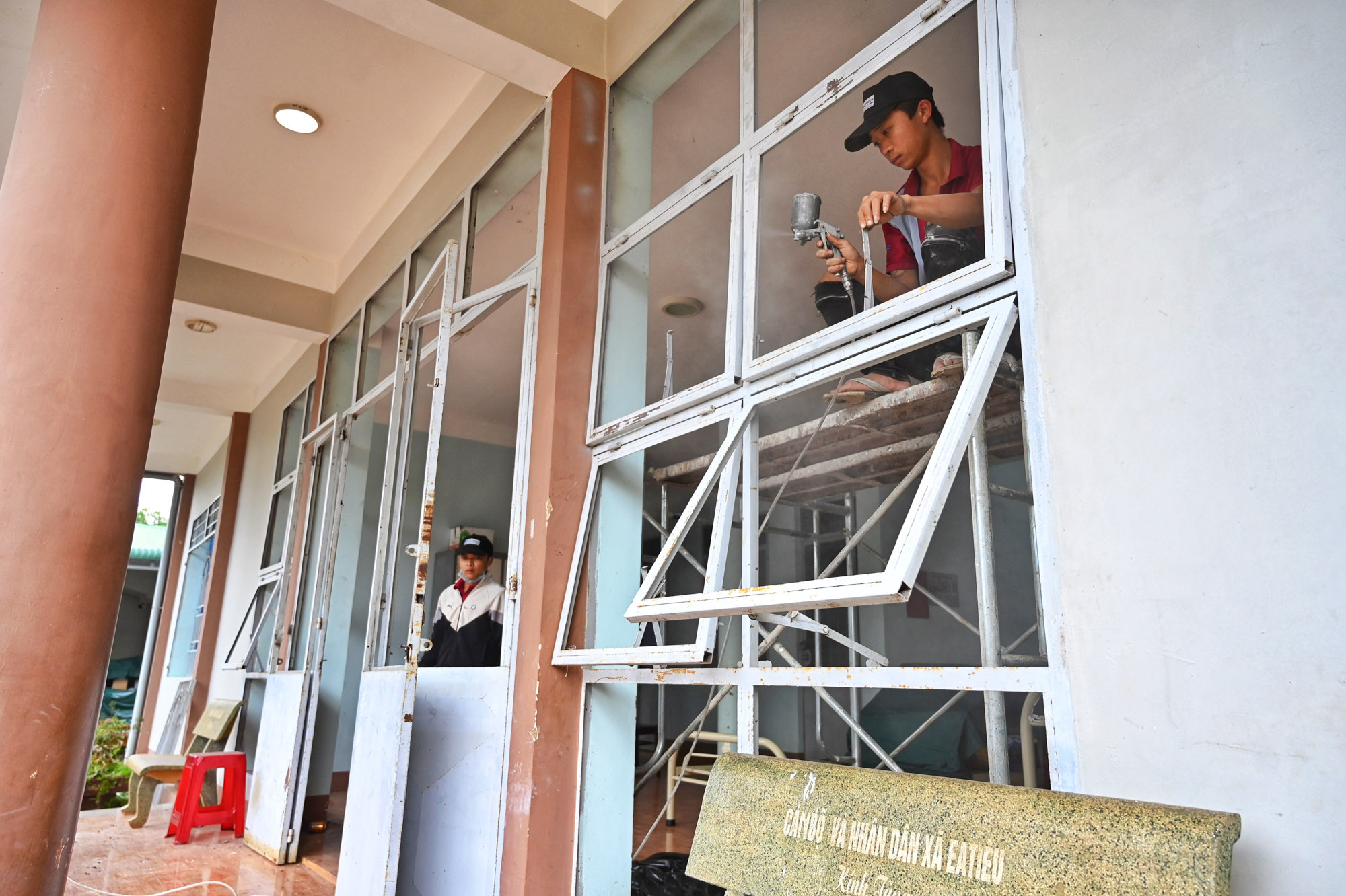 Tại UBND xã Ea Tiêu (huyện Cư Kuin, tỉnh Đắk Lắk), công tác khắc phục, sửa chữa cũng được các nhóm thợ tiến hành khẩn trương.