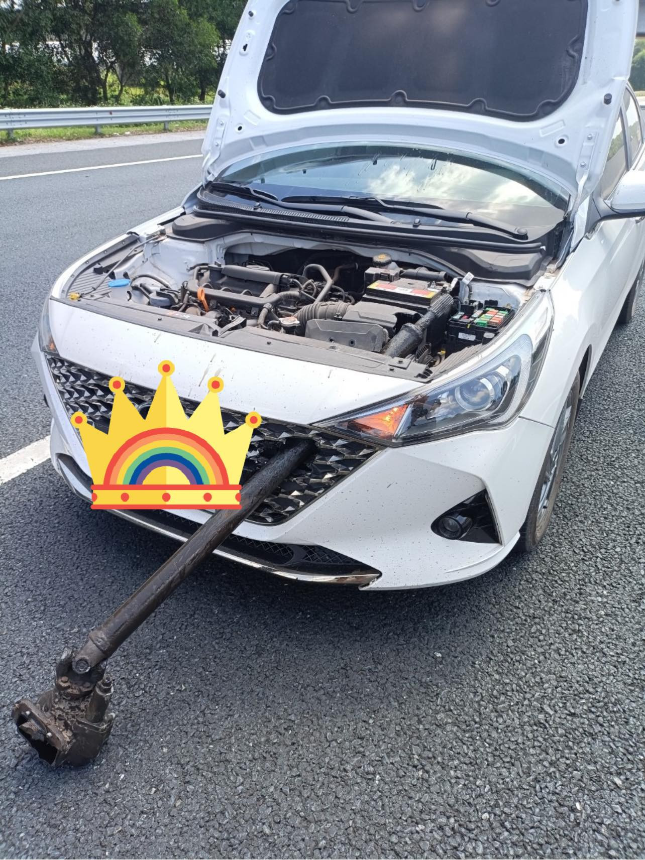 Hình ảnh được chia sẻ cho thấy, sau khi bị trục sắt đâm xuyên qua đầu xe, nắp capo chiếc Hyundai Accent bị bật tung. Ô tô buộc phải dừng giữa làn đường có tốc độ tối đa 120km/h.