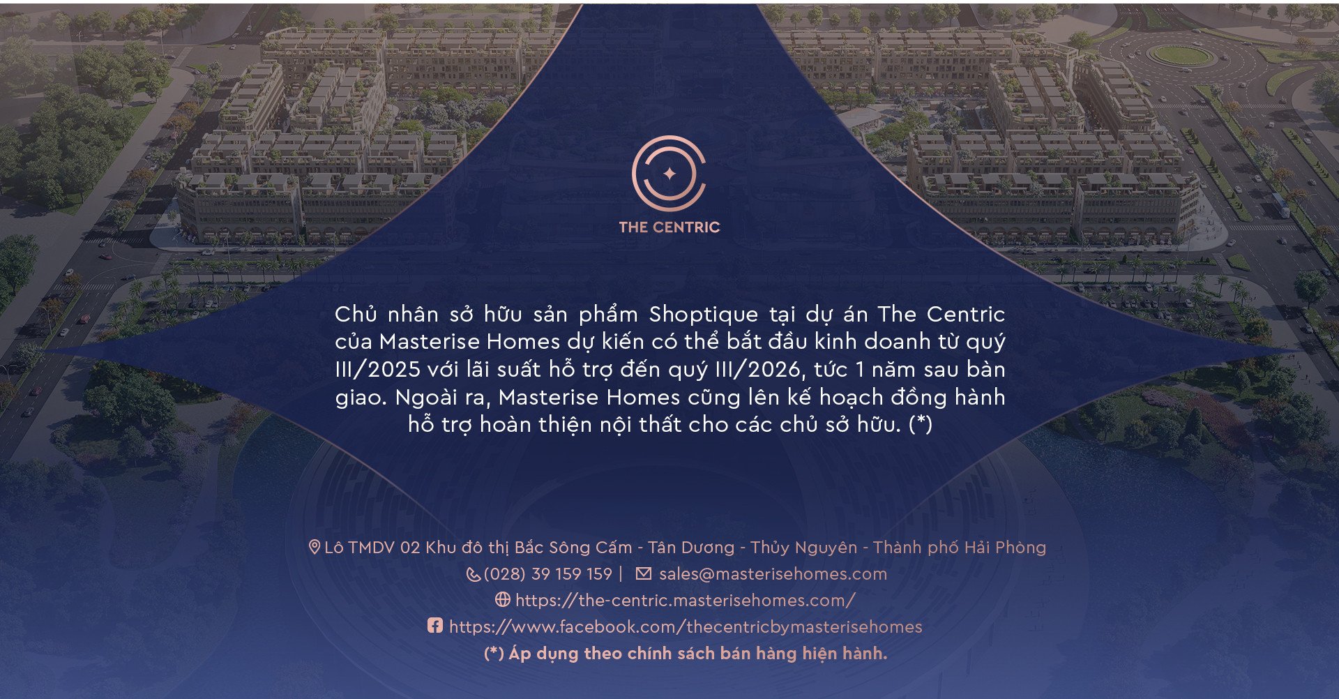 “Đây là sản phẩm được Masterise Homes tâm huyết nghiên cứu, mang đến tiềm năng gia tăng giá trị theo thời gian và cả những giá trị trường tồn cho ngành thương mại - dịch vụ tại Hải Phòng”, đại diện Masterise Homes cho biết.