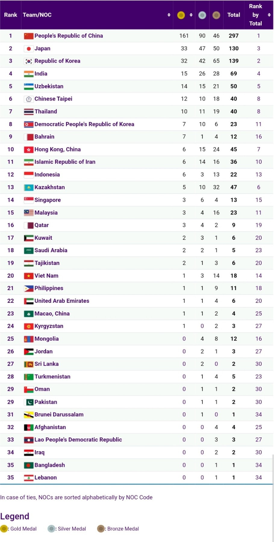 Bảng tổng sắp huy chương ASIAD 2023 (tính đến 21h20 ngày 3/10)