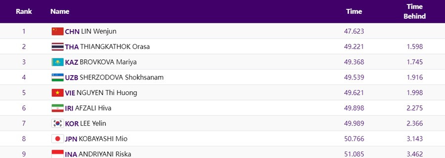 Nguyễn Thị Hương về đích thứ 5/9 VĐV tranh tài ở chung kết thuyền đơn nữ 200m, cô đạt thành tích 49 giây 621.