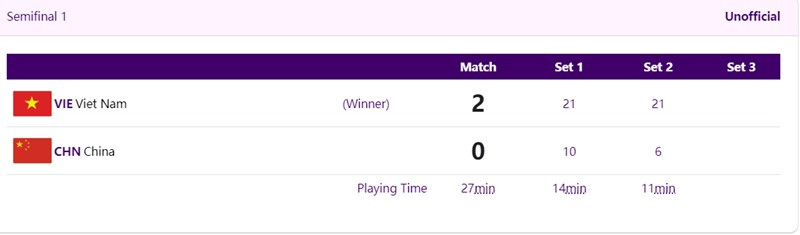 Ở trận bán kết nội dung cầu mây 4 nữ ASIAD 19 diễn ra vào chiều 3/10, đội tuyển Việt Nam dễ dàng vượt qua chủ nhà Trung Quốc với tỷ số 2-0 (21-10, 21-6) để lọt vào trận chung kết tranh HCV với đội tuyển nữ Indonesia vào sáng mai 4/10.