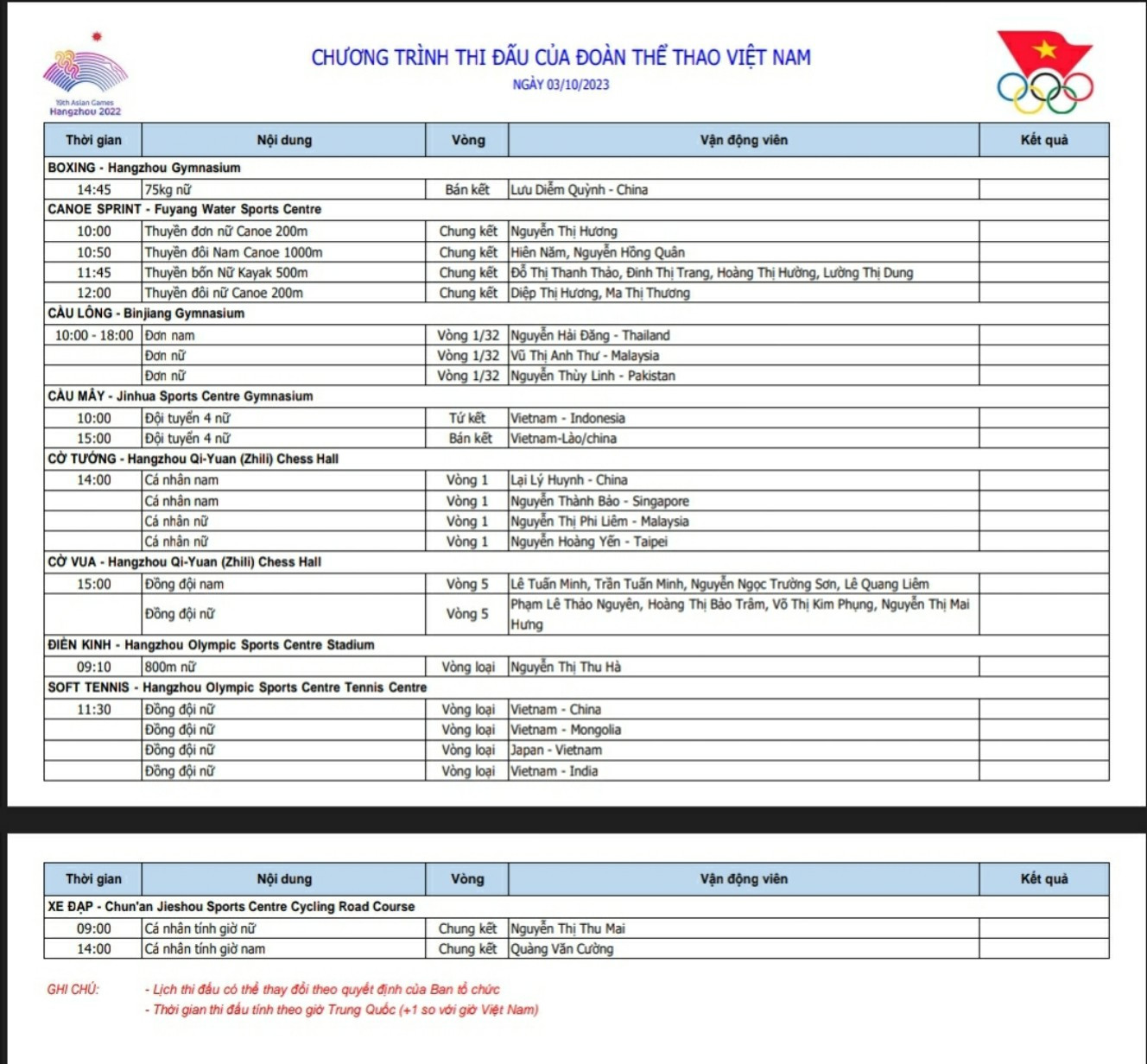 Hôm nay 3/10, đoàn thể thao Việt Nam thi đấu ở 9 môn gồm Boxing, Canoeing, Cầu lông, Cầu mây, Cờ tướng, Cờ vua, Điền kinh, Soft tennis và Xe đạp tại ASIAD 19.
