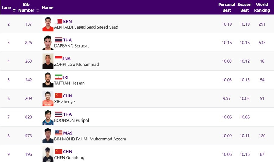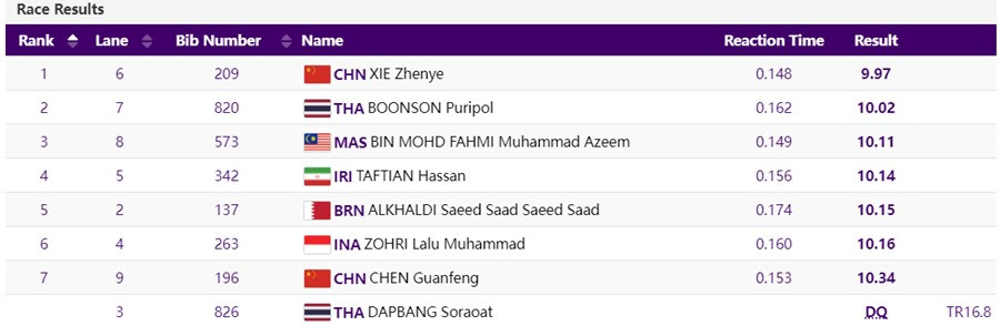 Ở chung kết chạy 100m nam, Đông Nam Á có 4 VĐV góp mặt gồm 2 của Thái Lan, 1 của Indonesia và 1 của Malaysia. Dapbang Soraoat của xứ sở Chùa vàng bị loại do lỗi xuất phát sớm.