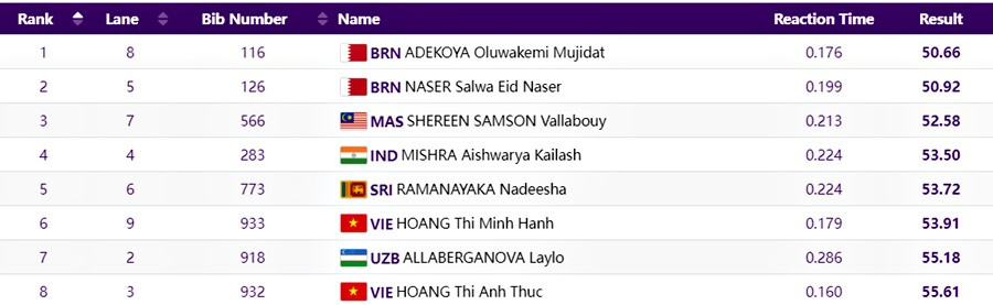 Minh Hạnh về đích thứ 6 với thành tích 53 giây 91, trong khi Ánh Thục xếp cuối với thời gian 55 giây 61. HCV và HCB đều thuộc về các chân chạy của Bahrain. VĐV người Malaysia SHEREEN SAMSON Vallabouy giành HCĐ.