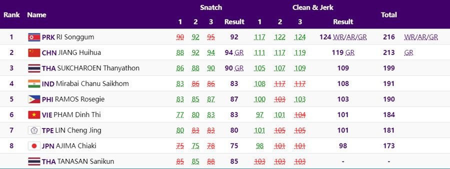 Trong khi đó, không chỉ giành HCV, VĐV của Triều Tiên Ri Songgum còn liên tiếp phá các kỷ lục châu Á, ASIAD và thế giới khi đạt mức tổng cử 216kg (92kg cử giật và 124kg cử đẩy). HCB thuộc về đô cử của chủ nhà Trung Quốc, Jiang Huihua.