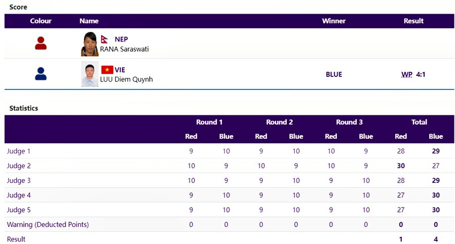 Tay đấm Lưu Diễm Quỳnh xuất sắc đánh bại đối thủ người Nepal Rana Saraswati với tỷ số 4-1 để giành quyền vào bán kết hạng 75kg nữ. Trận bán kết diễn ra vào chiều 3/10 tới. Đại diện của Việt Nam ít nhất có được tấm HCĐ.