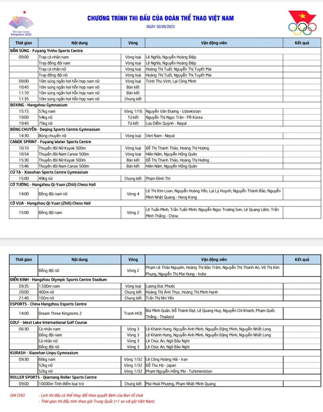 Trong ngày thi đấu hôm nay 30/9, đoàn thể thao Việt Nam tranh tài ở 12 môn gồm Bắn súng, Boxing, Bóng chuyền, Canoeing, Cử tạ, Cờ tướng, Cờ vua, Điền kinh, Thể thao điện tử, Kurash, Golf, Roller.