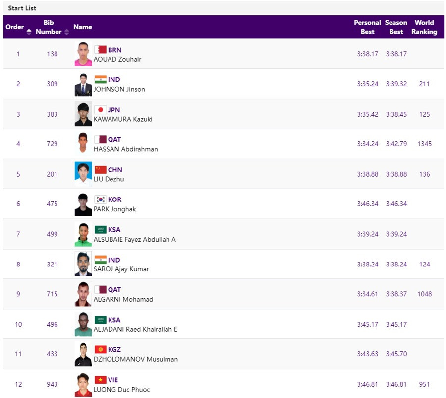 Lương Đức Phước về đích thứ 5 lượt chạy thứ nhất vòng loại chạy 1.500m nam và giành quyền vào chung kết với thành tích 3 phút 53 giây 97. Ở nội dung này, 12 VĐV có thành tích tốt nhất có vé vào thi đấu chung kết, diễn ra vào lúc 19h40 ngày mai (1/10).
