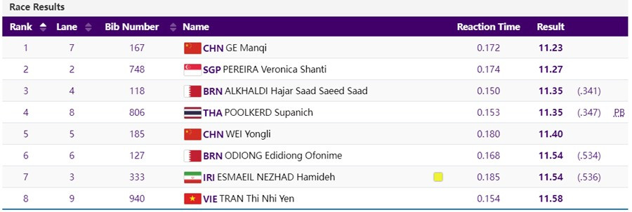 Trần Thị Nhi Yến chuẩn bị bước vào thi chung kết chạy 100m nữ. VĐV Việt Nam chạy ở làn số 9 không phải hạt giống. Đông Nam Á còn có PEREIRA Veronica Shanti người Singapore, ĐKVĐ SEA Games 32.