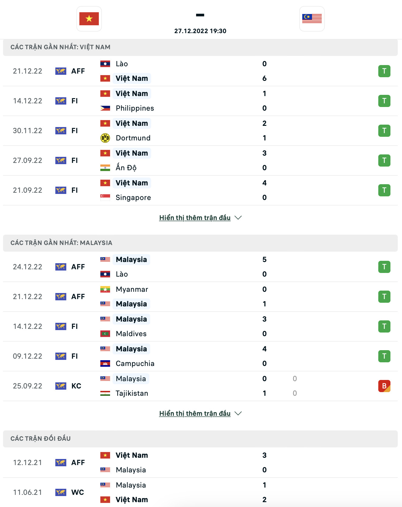 Dưới thời HLV Park Hang Seo, "Những chiến binh sao vàng" đã đánh bại Malaysia tới 5 lần và chỉ hòa đúng 1 trận. Năm ngoái, Việt Nam thắng 3-0 đầy thuyết phục trước Malaysia, cũng tại AFF Cup. Tháng 5 vừa rồi tại SEA Games 2022, U23 Việt Nam cũng thắng U23 Malaysia ở vòng bán kết của môn bóng đá nam Đại hội.
