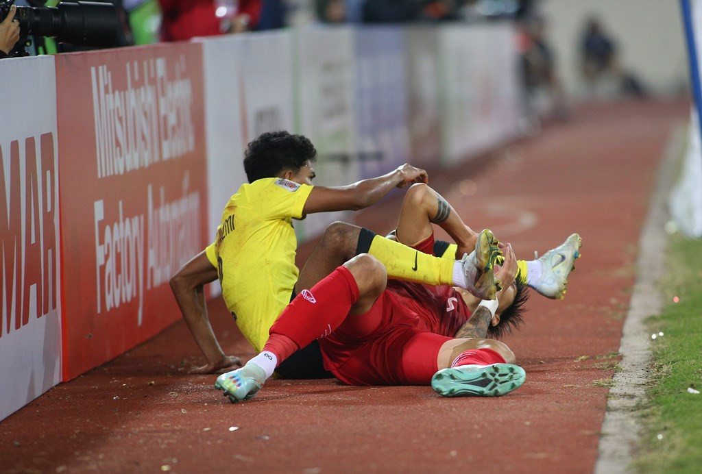 Văn Toàn trong một pha ham bóng đá phạm lỗi với cầu thủ Malaysia, trọng tài lập tức rút thẻ vàng thẻ vàng thứ 2 kèm theo chiếc thẻ đỏ đối với tiền đạo quê Hải Dương..