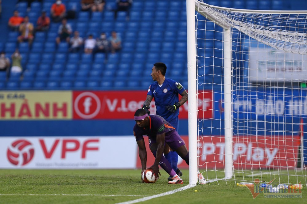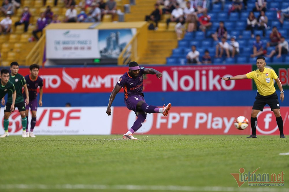 Sân 19/8 Nha Trang: Quế Ngọc Hải treo bóng sâu vào vòng cấm để Olaha thoát xuống rướn người khẽ chạm chân vào bóng khiến thủ môn Văn Trường bất ngờ để bóng bay vào lưới.