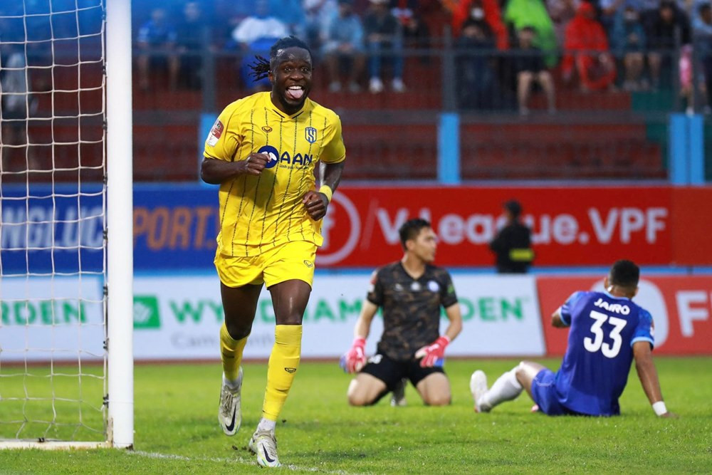 Sân Bình Dương: Victor Mansaray có liên tiếp hai cú dứt điểm khiến hàng phòng ngự đội chủ nhà chao đảo.