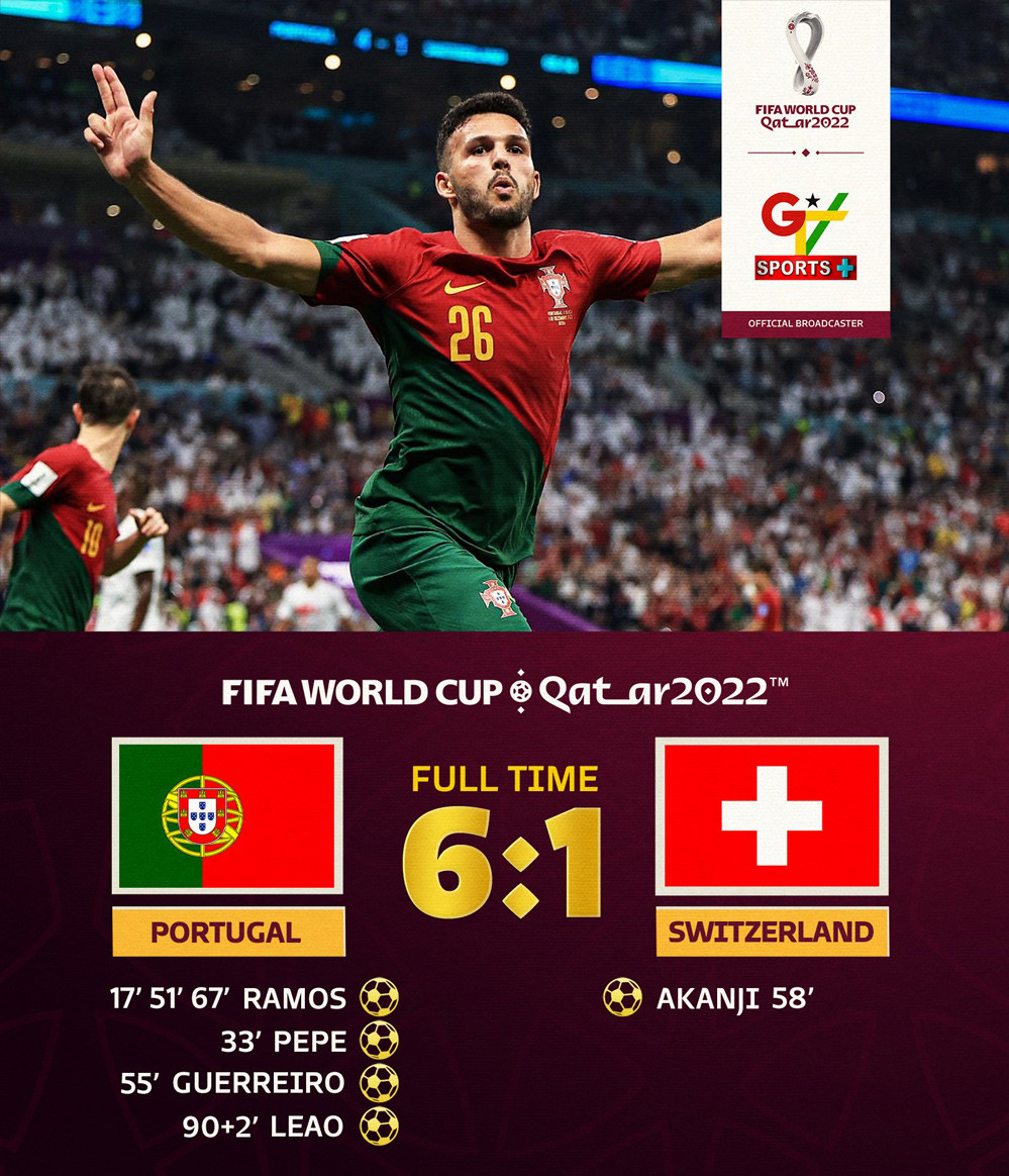 Bàn thắng: Goncalo Ramos 17', 51', 67', Pepe 33', Guerreiro 55', Leao 90'+2 - Akanji 58'