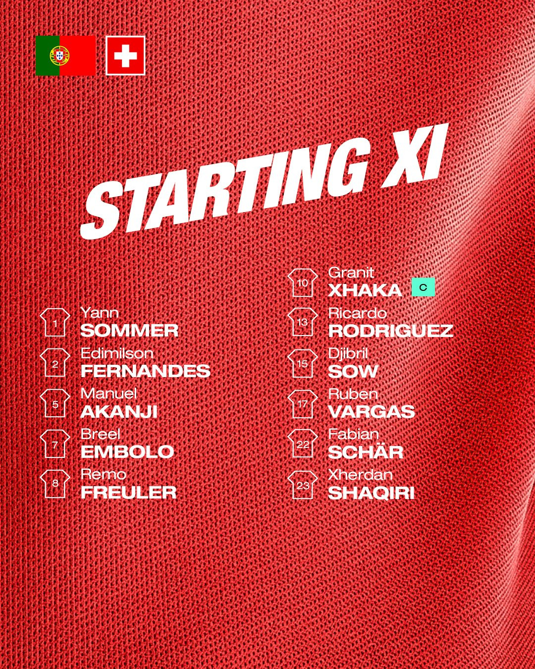 Thụy Sĩ: Sommer; Fernandes, Akanji, Schar (Comert 46'), Rodriguez; Freuler (Seferovic 54'), Xhaka; Shaqiri, Sow (Zakaria 54'), Vargas (Okafor 66'); Embolo.