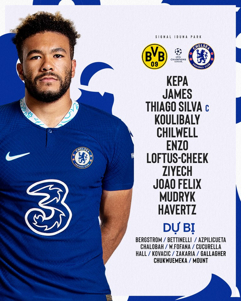 Chelsea: Kante, Pulisic, Broja, Edouard Mendy, Wesley Fofana, Kovacic, Denis Zakaria và Sterling chấn thương. Các tân binh Benoit Badiashile, Noni Madueke, David Fofana và Andrey Santos không được đăng ký dự Champions League.