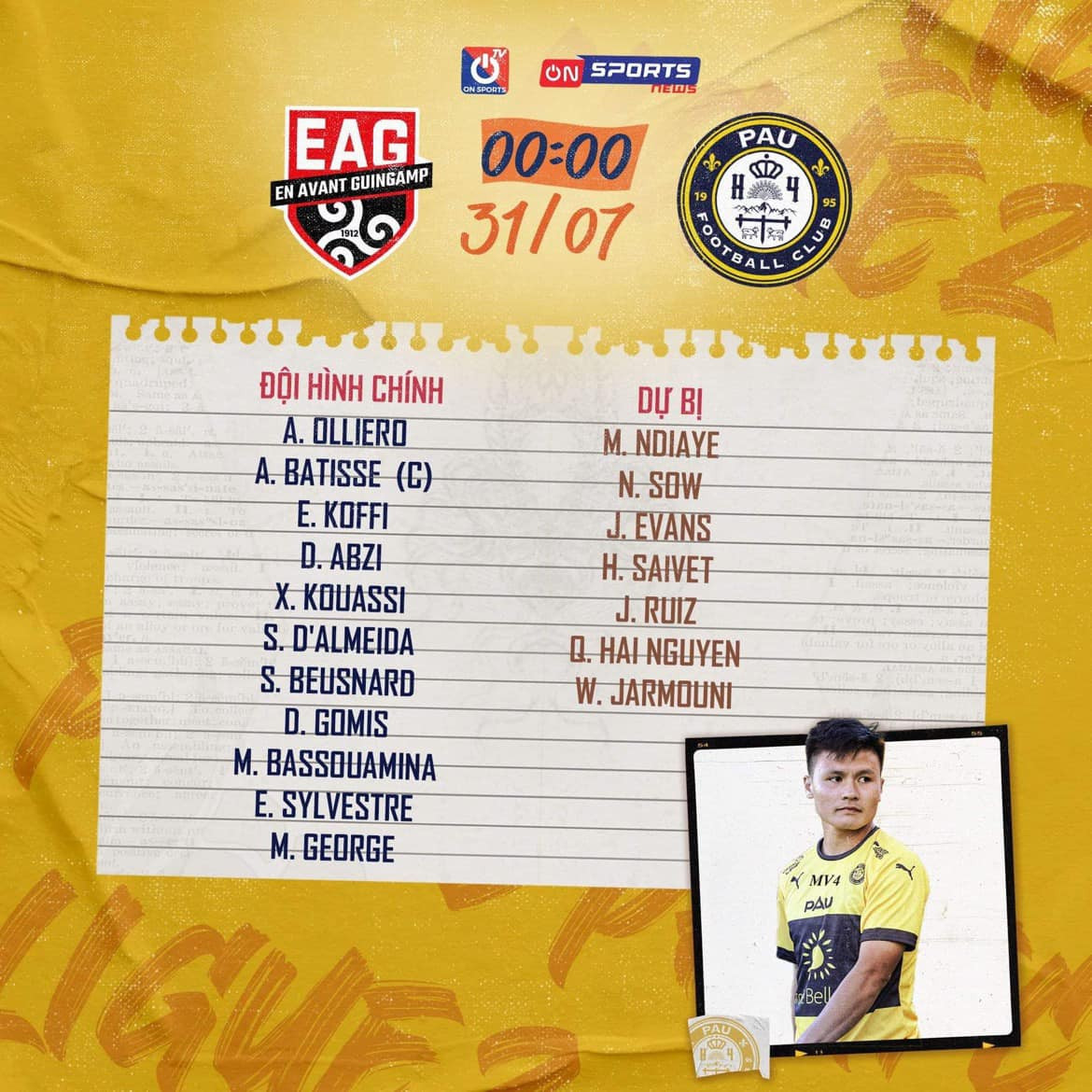 Trên trang chủ của Pau FC đã công bố danh sách 19 cầu thủ được đăng ký cho trận đấu đầu tiên của mùa giải 2022 - 2023 tại Ligue 2 giữa Guingamp và Pau FC sẽ diễn ra vào lúc 0h ngày 31/7. Theo đó, danh sách gồm có: Olliero, Ndiaye, Koffi, Abzi, Kouassi, Batisse, Ruiz, Evan's, Ros, Sow, d'Almeida, Beusnard, Saivet, Gomis, Sylvestre, Quang Hải, Bassouamina, George, Jarmouni.